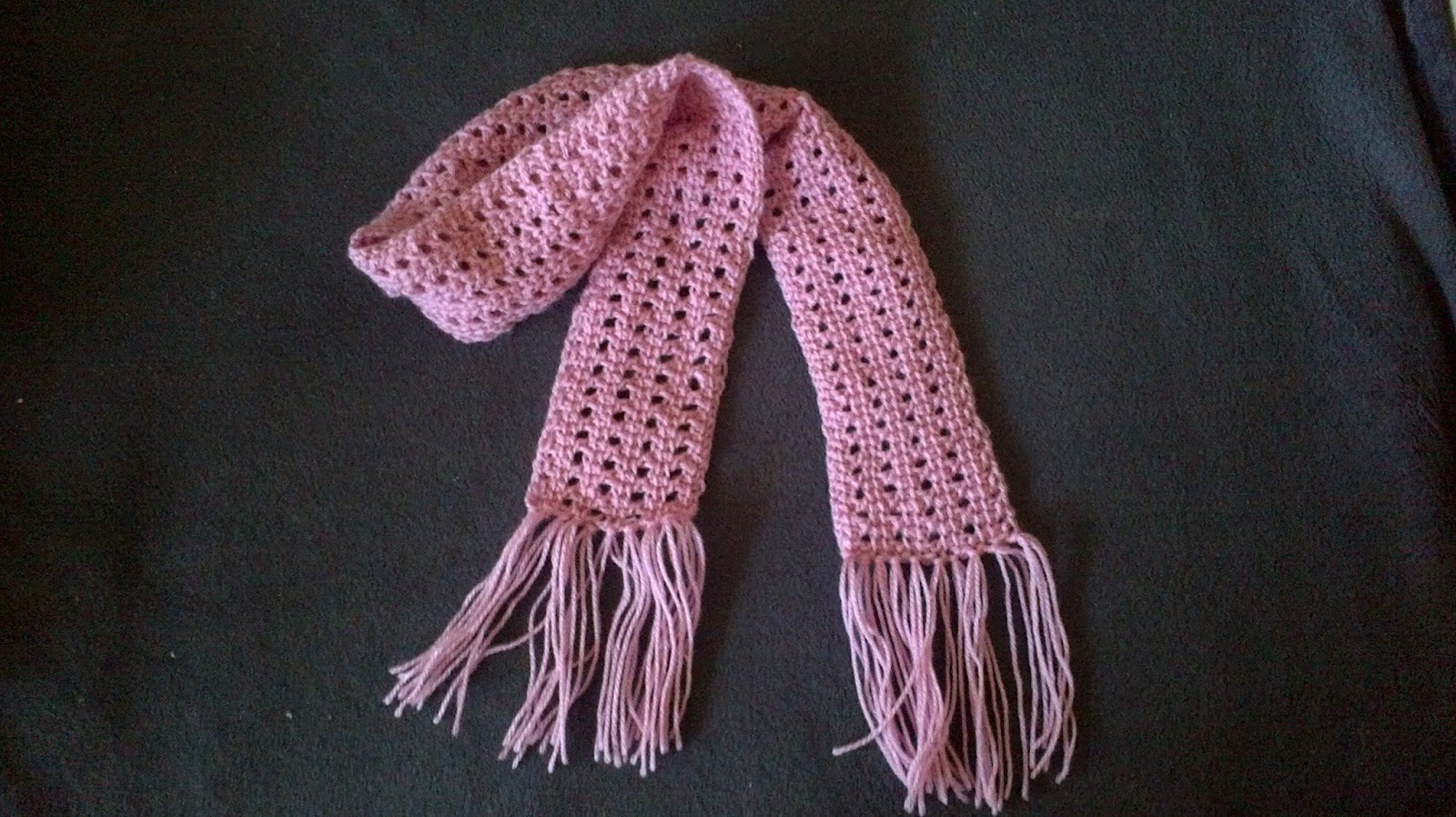 This pattern came from the Spring 2013 issue of Crochet! magazine, and is called the Bubblegum Lace Scarf. It's a super simple lace, done with Tunisian crochet. It's my first complete project with Tunisian, other than a little bookmark I did to practise the Tunisian Simple Stitch. It is also my first time making tassels, which were as easy as I hoped. It was a pattern that was good to do while anxious in a hangout, or while watching television.